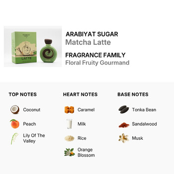 From the very first spritz, Matcha Latte captivates with sparkling top notes of creamy coconut, juicy peach, and soft lily of the valley. The heart of the fragrance unfolds with a cozy combination of caramel, warm milk, delicate rice, and fresh orange blossom, creating a comforting and feminine aura. As the scent settles, it reveals a rich base of tonka bean, smooth sandalwood, and airy musk, wrapping you in a soft, irresistible finish.