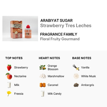 At first spray, Strawberry Tres Leches opens with a juicy burst of ripe strawberry and nectarine, softened by creamy milk and delicate freesia. These playful top notes lead into a heart that's rich and indulgent, featuring orange blossom, fluffy marshmallow, gooey caramel, and sweet milk candy. The scent finishes with a warm and lasting base of smooth vanilla, soft white musk, and elegant ambergris—creating a comforting and irresistible trail.