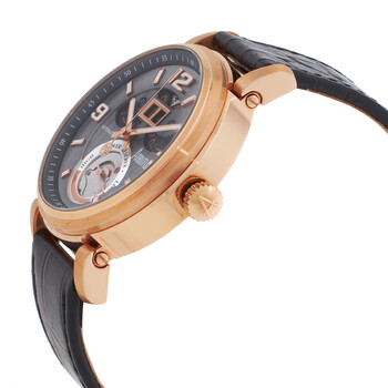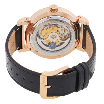 Rose gold-tone stainless steel case with a black genuine leather strap. Fixed rose gold-tone stainless steel bezel. Grey dial with rose gold-tone hands and Arabic numeral & index hour markers. Minute markers around the outer rim. Dial Type: Analog. Luminescent hands and markers. Day display at the 12 o'clock position. Automatic movement. Scratch resistant sapphire crystal. Pull / push crown. Transparent case back. Round case shape, case size: 44.5 mm. Band width: 22 mm. Tang clasp. Water resistant at 50 meters / 165 feet. Functions: date, hour, minute, second. Broadway Series. Dress watch style. Arbutus Broadway Automatic Grey Dial Men's Watch AR1607RNB.