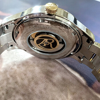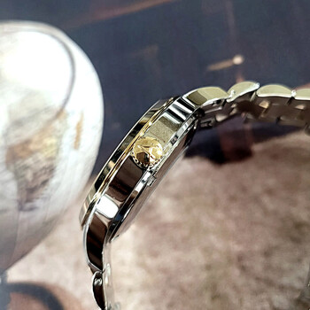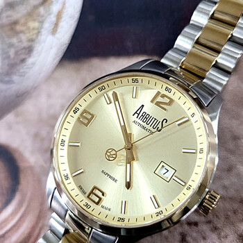 It contains a Swiss-made automatic movement and is assembled in Switzerland Yellow gold-tone stainless steel case with a two-tone (silver-tone and yellow gold-tone) stainless steel bracelet. Fixed yellow gold-tone stainless steel bezel. Gold-tone dial with yellow gold-tone hands and Arabic numeral & index hour markers. Minute markers around the outer rim. Dial Type: Analog. Date display at the 3 o'clock position. Automatic movement. Scratch resistant sapphire crystal. Pull / push crown. Transparent case back. Round case shape, case size: 42 mm. Band width: 20 mm. Fold over clasp with a safety release. Water resistant at 50 meters / 165 feet. Functions: date, hour, minute, second. Swiss-made Collection Series. Dress watch style. Watch label: Swiss Made. Arbutus Swiss-made Collection Automatic Gold Dial Men's Watch ARS1613TGGS.