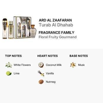 Turab Al Dhahab belongs to the captivating Floral Fruity Gourmand fragrance family. It opens with the bright and sparkling notes of white flowers and zesty lime, creating a refreshing and uplifting introduction. As the scent unfolds, you’ll discover the creamy sweetness of coconut milk blended with warm vanilla and a hint of nutmeg, adding depth and charm. Finally, a soft touch of musk settles on your skin, leaving a lasting, graceful finish.