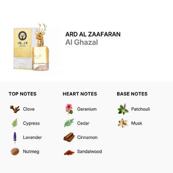 The journey of Al Ghazal begins with invigorating top notes of clove, cypress, lavender, nutmeg, lemon, and bergamot. These vibrant scents awaken your senses, setting the stage for the heart of the fragrance. As the scent unfolds, you are embraced by the warm and earthy heart notes of geranium, cedar, cinnamon, and sandalwood, which provide a comforting and enduring aroma.