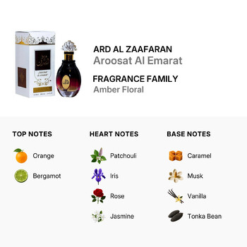 As the hours pass, the fragrance settles into its captivating base notes. The warm and inviting blend of caramel, musk, vanilla, tonka bean, and agarwood (oud) leaves a lasting impression, enveloping you in a comforting and luxurious embrace. Aroosat Al Emarat is crafted by the renowned design house of Ard Al Zaafaran, located in the United Arab Emirates, a region celebrated for its rich and aromatic scents.