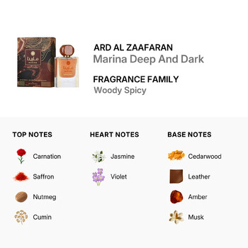 Belonging to the Woody Spicy fragrance family, Marina Deep And Dark opens with a captivating blend of carnation, saffron, nutmeg, and cumin. These exotic top notes create an instantly warm and intriguing impression, setting the stage for a truly luxurious experience. As the scent unfolds, delicate heart notes of jasmine and violet add a soft floral whisper that balances the spice with grace and charm.