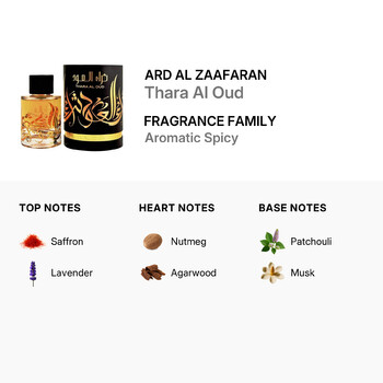 Whether you're looking for a signature scent or a special gift, Thara Al Oud by Ard Al Zaafaran is sure to impress. Please note that this item is available for shipment only within the Contiguous United States and Canada. Embrace the allure of Thara Al Oud and let its aromatic spicy notes captivate your senses.