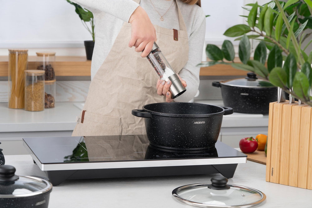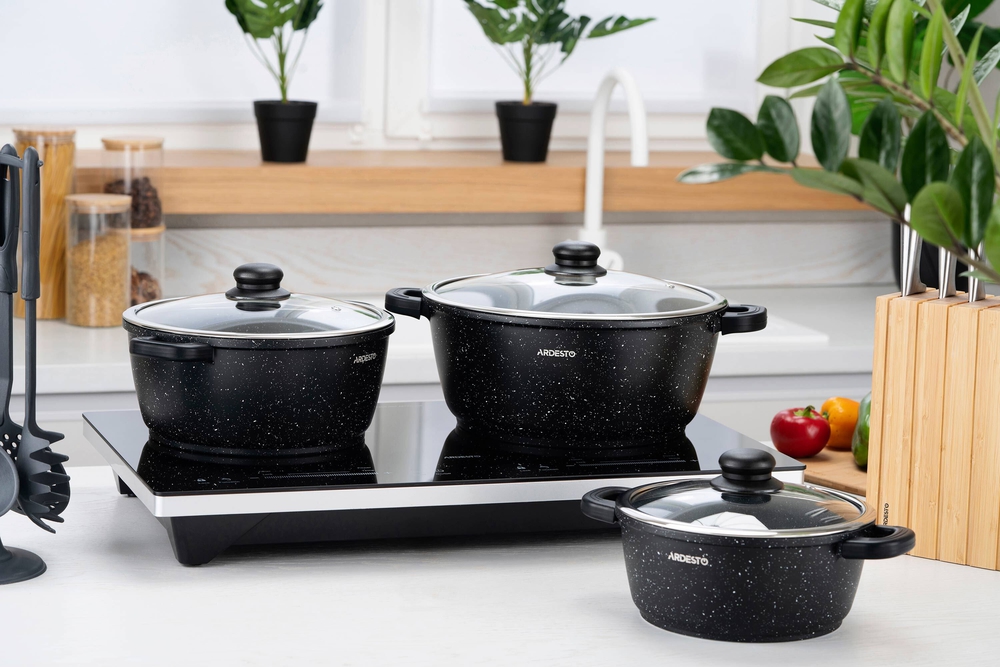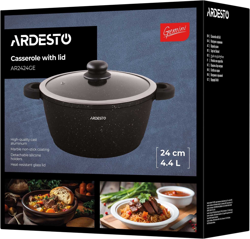 Ardesto-ს Gemini-ს სერიის კლასიკური კერძებისთვის განკუთვნილი ქვაბი დამზადებულია ალუმინისგან, რომელსაც მოყვება თავსახური. შიდა და გარე ნაწილი შავია. ჭურჭლის სერია Gemini იყენებს Greblon C2 არაწებოვან საფარს. სახელური დამზადებულია ბაკელიტისგან, რათა არ გახურდეს.