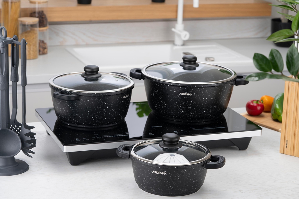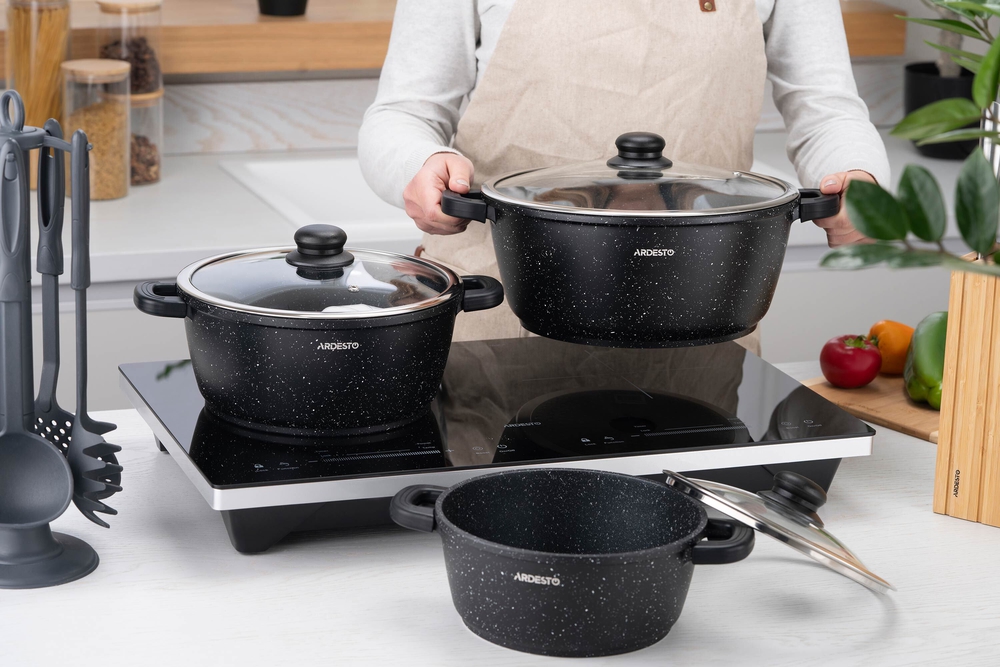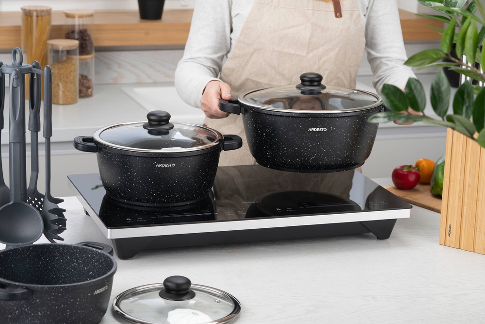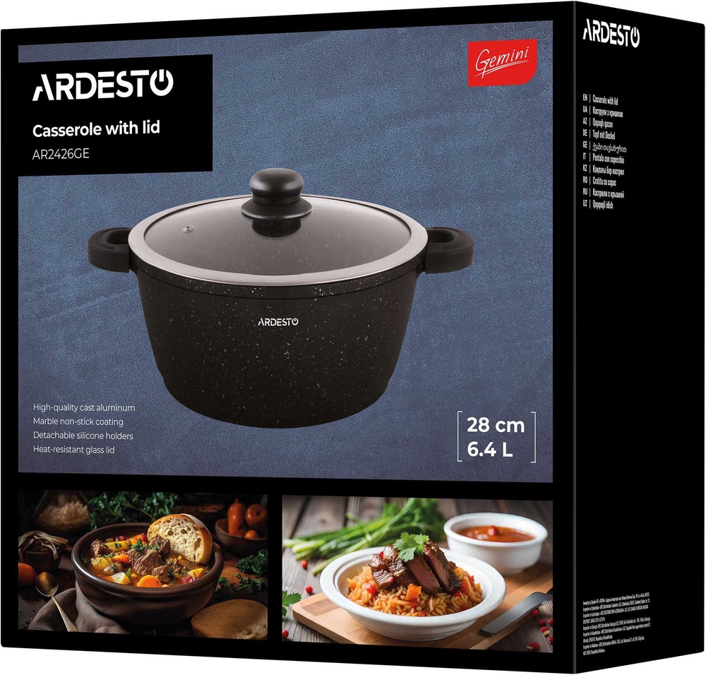 Ardesto-ს Gemini-ს სერიის კლასიკური კერძებისთვის განკუთვნილი ქვაბი დამზადებულია ალუმინისგან, რომელსაც მოყვება თავსახური. შიდა და გარე ნაწილი შავია. ჭურჭლის სერია Gemini იყენებს Greblon C2 არაწებოვან საფარს. სახელური დამზადებულია ბაკელიტისგან, რათა არ გახურდეს.