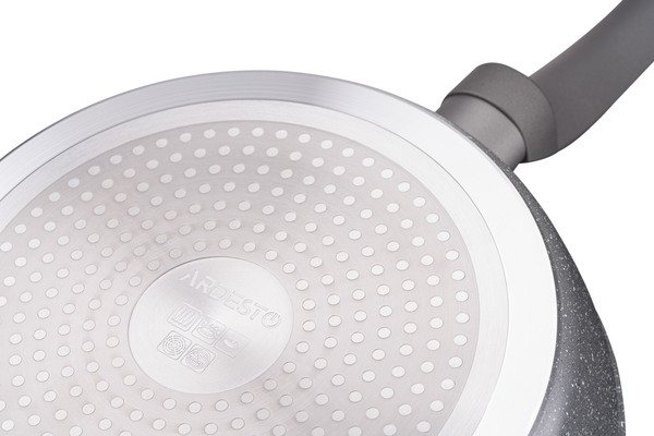 Ardesto Midori 28 სმ-იანი ტაფა დამზადებულია ალუმინისგან და გამოირჩევა მარმარილოს დიზაინით.