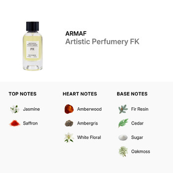 Artistic Perfumery FK opens with a stunning burst of jasmine and saffron, delivering a floral yet spicy introduction that grabs attention right from the start. As the scent unfolds, warm heart notes of amberwood, ambergris, and delicate white florals wrap you in a soft, radiant embrace. Finally, the base notes of fir resin, cedar, sugar, and oakmoss leave a rich, earthy trail that lingers beautifully throughout the day.