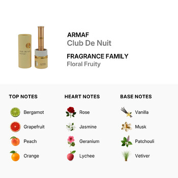 Club De Nuit opens with a lively burst of bergamot, grapefruit, peach, and orange—creating a bright and cheerful introduction. As the scent unfolds, a romantic heart of rose, jasmine, geranium, and lychee adds elegance and depth. Finally, the fragrance settles into a warm and sensual base of vanilla, musk, patchouli, and vetiver, leaving a lasting impression that feels both cozy and confident.