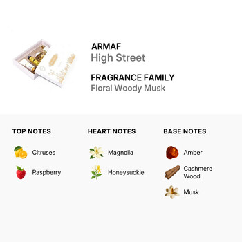 High Street opens with a bright splash of citruses and sweet raspberry, creating a lively and refreshing introduction. As the scent unfolds, delicate heart notes of magnolia and honeysuckle bloom, adding a soft and romantic floral layer. The fragrance finishes with a cozy blend of amber, cashmere wood, and musk, wrapping you in warmth and elegance that lingers all day.