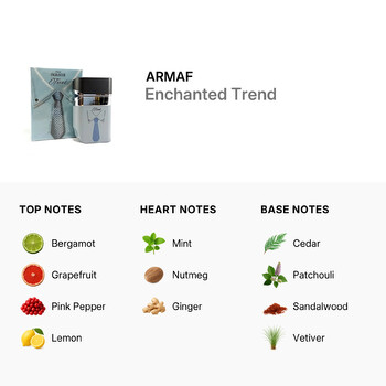 The base of Armaf Enchanted Trend settles into a smooth, masculine foundation of cedar, patchouli, sandalwood, and vetiver. These rich, earthy notes create a long-lasting finish that exudes confidence and sophistication throughout the day.