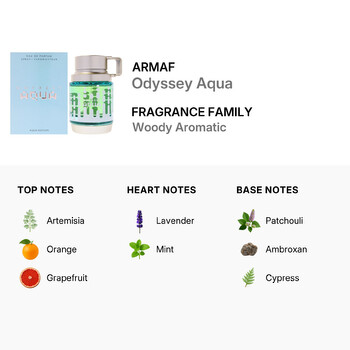 Belonging to the woody aromatic fragrance family, Odyssey Aqua opens with a fresh burst of artemisia, orange, and grapefruit. These vibrant top notes spark instant energy and charm, setting a lively tone from the first spray. As the scent develops, heart notes of soothing lavender and cool mint create a refreshing balance, bringing a calm and clean feel that’s both modern and timeless.