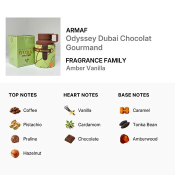 From the very first spray, Odyssey Dubai Chocolat Gourmand awakens your senses with a delicious burst of coffee, pistachio, praline, hazelnut, and the exotic sweetness of knafeh. These top notes create a warm and inviting opening, perfect for leaving a lasting impression.