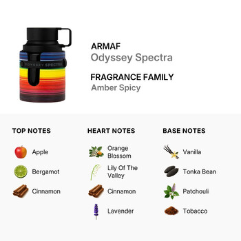 Step into a world of bold elegance with Armaf Odyssey Spectra for Men, a captivating Eau de Parfum that launched in 2024. This 2.0 oz fragrance is a masterpiece crafted by the renowned Middle Eastern design house, Armaf, based in the United Arab Emirates. Odyssey Spectra belongs to the Amber Spicy fragrance family, delivering a rich, vibrant scent experience made for confident, modern men.