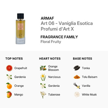 From the first spritz, Art 06 - Vaniglia Esotica Profumi d'Art X surrounds you in a vibrant wave of top notes including grapefruit, mango, peach, and passionfruit. These juicy fruits are perfectly paired with gardenia, black currant, strawberry, mint, and more—creating a refreshing and playful opening that instantly captivates.