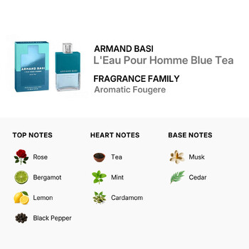 L'Eau Pour Homme Blue Tea opens with a vibrant blend of top notes, including the delicate aroma of rose, the zesty freshness of bergamot and lemon, and a hint of spicy black pepper. This invigorating introduction sets the stage for an unforgettable olfactory journey.