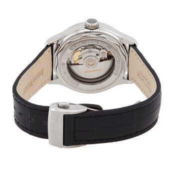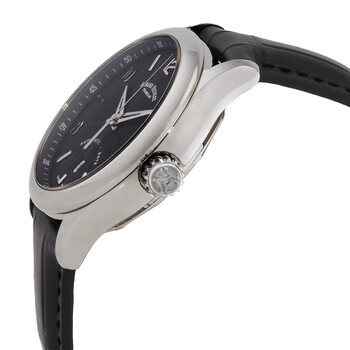 Silver-tone stainless steel case with a black leather strap. Fixed silver-tone stainless steel bezel. Black dial with silver-tone hands and index-Arabic numeral hour markers. Minute markers around the outer rim. Dial Type: Analog. Date display at the 3 o'clock position. Automatic movement. Scratch resistant sapphire crystal. Transparent case back. Round case shape, case size: 42 mm. Band width: 22 mm. Water resistant at 100 meters / 330 feet. Functions: date, hour, minute, second. Sport watch style. Watch label: Swiss Made. Armand Nicolet Automatic Black Dial Men's Watch A840AAA-NR-P840NR2.