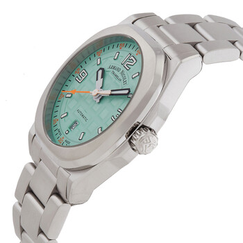 Silver-tone stainless steel case and bracelet. Fixed silver-tone stainless steel bezel. Aqua blue dial with silver-tone hands and index hour markers. Arabic numerals appear at the 3, 9 and 12 o'clock positions. Arabic numeral minute markers (at 5 minute intervals). Minute markers around the outer rim. Dial Type: Analog. Date display at the 6 o'clock position. ETA Caliber 2824-2 Automatic movement, based upon ETA 2824, containing 25 Jewels, bitting at 28800 vph, and has a power reserve of approximately 38 hours. Scratch resistant sapphire crystal. Pull / push crown. Transparent case back. Round case shape, case size: 41 mm, case thickness: 12.5 mm. Band width: 20 mm. Deployment clasp. Water resistant at 50 meters / 165 feet. Functions: date, hour, minute, second. Jh9 Series. Dress watch style. Watch label: Swiss Made. Armand Nicolet JH9 Automatic Aqua Blue Dial Men's Watch A660HAA-ZO-MA4680A.