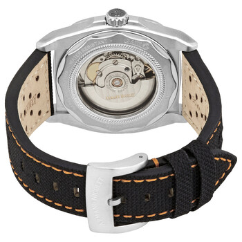 Stainless steel case with a black canvas strap with orange stitching. Fixed stainless steel bezel. Black dial with silver-tone hands and index hour markers. Arabic numerals appear at the 3, 9 and 12 o'clock positions. Orange Arabic numeral minute markers (at 5 minute intervals). Minute markers around the outer rim. Dial Type: Analog. Luminescent hands and markers. Date display at the 6 o'clock position. ETA caliber 2824-2 Automatic movement, based upon ETA 2824, containing 25 Jewels, bitting at 28800 vph, and has a power reserve of approximately 38 hours. Scratch resistant sapphire crystal. Transparent case back. Round case shape. Case size: 41 mm. Case thickness: 12.5 mm. Tang clasp. Water resistant at 50 meters / 165 feet. Functions: date, hour, minute, second. Jh9 Series. Dress watch style. Watch label: Swiss Movt. Armand Nicolet JH9 Automatic Black Dial Men's Watch A660HAA-NO-P0668NO8.