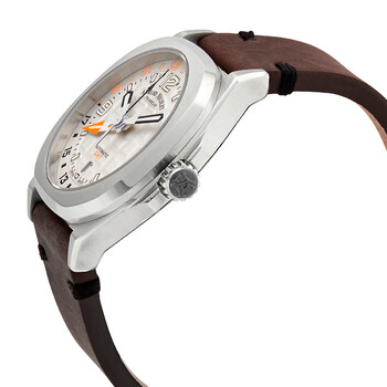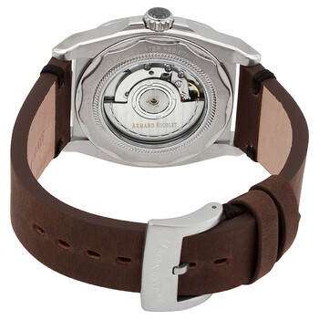 Stainless steel case with a brown leather strap. Fixed stainless steel bezel. Silver dial with silver-tone hands and index hour markers. Arabic numerals appear at the 3, 9 and 12 o'clock positions. 24 hour markers. Minute markers around the outer rim. Dial Type: Analog. Luminescent hands and markers. Date display at the 6 o'clock position. GMT AN330 (based on ETA 2893-2 or SW-330 modified per Armand Nicolet’s specifications) automatic movement. Scratch resistant sapphire crystal. Pull / push crown. Transparent case back. Round case shape. Case size: 41 mm. Case thickness: 12 mm. Band width: 24 mm. Tang clasp. Water resistant at 50 meters / 165 feet. Functions: GMT, second time zone, hour, minute, second. Jh9 Series. Dress watch style. Watch label: Swiss Made, GMT. Armand Nicolet JH9 Automatic Silver Dial Men's Watch A663HAA-AO-PK4140TM.