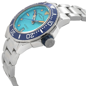 Silver-tone stainless steel case and bracelet. Uni-directional rotating blue ceramic bezel. Aqua dial with silver-tone hands and index hour markers. Minute markers around the outer rim. Dial Type: Analog. Luminescent hands and markers. Date display at the 6 o'clock position. Automatic movement. Scratch resistant sapphire crystal. Round case shape, case size: 41 mm. Fold over clasp with a safety release. Water resistant at 300 meters / 1000 feet. Functions: date, hour, minute, second. Jsh Series. Watch label: Swiss Made. Armand Nicolet JSH Automatic Men's Watch A481PGU-TF-MA2481AA.