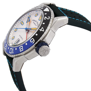 Silver-tone stainless steel case with a black canvas strap. Rotating black and blue ceramic bezel. Silver dial with silver-tone hands and index hour markers. Minute markers around the outer rim. Dial Type: Analog. Luminescent hands and markers. Date display at the 6 o'clock position. Automatic movement. Scratch resistant sapphire crystal. Solid case back. Round case shape, case size: 44 mm. Buckle clasp. Water resistant at 300 meters / 1000 feet. Functions: GMT, hour, minute, second. Jsh Series. Sport watch style. Watch label: Swiss Made. Armand Nicolet JSH Automatic Silver Dial Men's Watch A486RGU-AU-P0668NZ8.