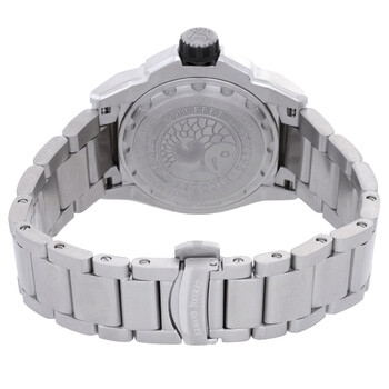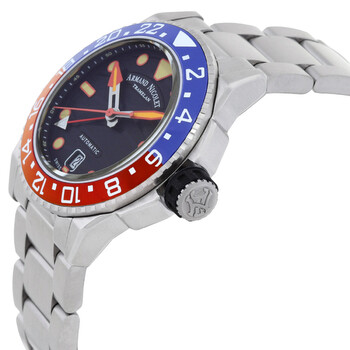 Silver-tone stainless steel case and bracelet. Rotating blue and orange ceramic bezel. Black dial with silver-tone hands and index hour markers. Minute markers around the outer rim. Dial Type: Analog. Luminescent hands and markers. Date display at the 6 o'clock position. Sellita Caliber SW330 Automatic movement, containing 25 Jewels, bitting at 28800 vph, and has a power reserve of approximately 42 hours. Scratch resistant sapphire crystal. Solid case back. Round case shape, case size: 41 mm. Fold over clasp with a safety release. Water resistant at 300 meters / 1000 feet. Functions: date, GMT, second time zone, hour, minute, second. Jsh Series. Watch label: Swiss Made. Armand Nicolet JSH GMT Automatic Black Dial Men's Watch A487RGN-NO-MA2481AA.