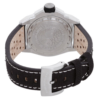 Silver-tone stainless steel case with a black canvas strap. Rotating blue and orange ceramic bezel. Silver-tone hands and index hour markers. Minute markers around the outer rim. Dial Type: Analog. Luminescent hands and markers. Date display at the 6 o'clock position. Sellita Caliber SW330 Automatic movement, containing 25 Jewels, bitting at 28800 vph, and has a power reserve of approximately 42 hours. Scratch resistant sapphire crystal. Solid case back. Round case shape, case size: 41 mm. Tang clasp. Water resistant at 300 meters / 1000 feet. Functions: date, GMT, second time zone, hour, minute, second. Jsh Series. Watch label: Swiss Made. Armand Nicolet JSH GMT Automatic Men's Watch A487RGN-KO-P0640NC8.