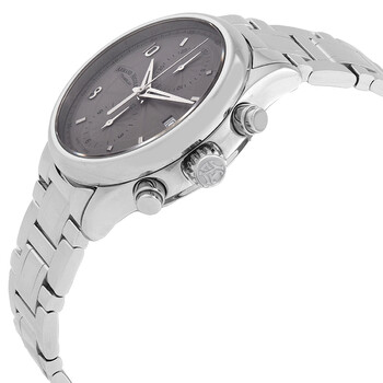 Silver-tone stainless steel case and bracelet. Fixed silver-tone stainless steel bezel. Grey dial with silver-tone hands and index-Arabic numeral hour markers. Minute markers around the outer rim. Dial Type: Analog. Date display at the 3 o'clock position. Chronograph - two sub-dials displaying: 30 minute and 12 hour. Calibre SW-500 automatic movement. Scratch resistant sapphire crystal. Transparent case back. Round case shape, case size: 42 mm, case thickness: 13 mm. Band width: 22 mm. Water resistant at 100 meters / 330 feet. Functions: chronograph, date, hour, minute, second. M02-4 Series. Sport watch style. Watch label: Swiss Made. Armand Nicolet M02-4 Chronograph Automatic Grey Dial Men's Watch A844AAA-GR-M9742.