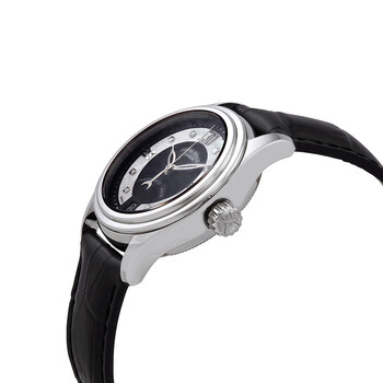 Stainless steel case with a black (alligator) leather strap. Fixed stainless steel bezel. Black guilloche (white mother of pearl) dial with silver-tone skeleton hands and index hour markers. Roman numerals mark the 3, 9 and 12 o'clock positions. Minute markers around the outer rim. Dial Type: Analog. Luminescent hands and markers - superluminova. Date display at the 6 o'clock position. Sellita Caliber SW200 Automatic movement, containing 26 Jewels, bitting at 28800 vph, and has a power reserve of approximately 38 hours. Scratch resistant sapphire crystal. Screw down crown. Transparent case back. Round case shape. Case size: 34 mm. Case thickness: 11.8 mm. Band width: 18 mm. Band length: 7 inches. Deployment clasp. Water resistant at 100 meters / 330 feet. Functions: date, hour, minute, second. M03-2 Series. Luxury watch style. Watch label: Swiss Made. Armand Nicolet M03-2 Automatic Black Guilloche and White Mother of Pearl Dial Ladies Watch A151AAA-NN-P882NR8.