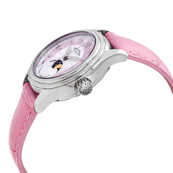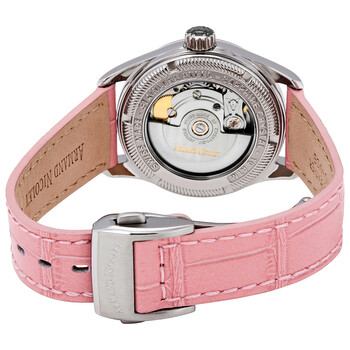 Stainless steel case with a pink (alligator) leather strap. Fixed stainless steel bezel. Pink mother of pearl dial with luminous silver-tone leaf-style hands and index hour markers. Roman numerals mark the 3, 9 and 12 o'clock positions. Minute markers around the outer rim. Dial Type: Analog. Luminescent hands and markers - superluminova. Moonphase display. Sellita caliber SW280 automatic movement, containing 26 Jewels, bitting at 28800 vph, and has a power reserve of approximately 38 hours. Scratch resistant sapphire crystal. Pull / push crown. Transparent case back. Round case shape. Case size: 34 mm. Case thickness: 11.8 mm. Band width: 18 mm. Band length: 7 inches. Fold over clasp. Water resistant at 100 meters / 330 feet. Functions: moon phase, hour, minute, second. M03-2 Series. Luxury watch style. Watch label: Swiss Made. Armand Nicolet M03-2 Automatic Pink Mother of Pearl Dial Ladies Watch A153AAA-AS-P882RS8.