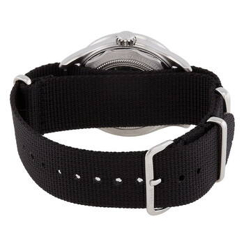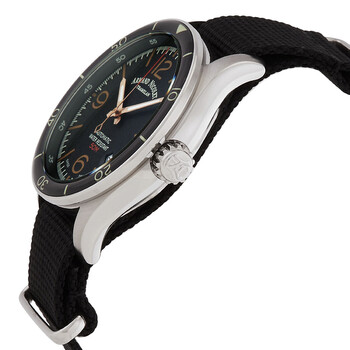 Silver-tone stainless steel case with a black NATO band. Uni-directional rotating black stainless steel bezel. Black dial with rose gold-tone hands and index-Arabic numeral hour markers. Arabic numerals appear at the 3, 9 and 12 o'clock positions. Arabic numeral minute markers (at 5 minute intervals). Minute markers around the outer rim. Dial Type: Analog. Date display between 4 and 5 o'clock position. Automatic movement. Scratch resistant sapphire crystal. Pull / push crown. Transparent case back. Round case shape, case size: 41 mm. Buckle clasp. Water resistant at 50 meters / 165 feet. Functions: date, hour, minute, second. M2h Series. Sport watch style. Watch label: Swiss Made. Armand Nicolet M2H Automatic Black Dial Men's Watch A740HNA-NS-BN22481AANN.