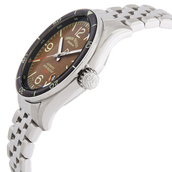 Silver-tone stainless steel case and bracelet. Fixed black acrylic bezel. Brown dial. Minute markers around the outer rim. Dial Type: Analog. Luminescent hands. Between the 4 and 5 o'clock position. Date AN200 (based on SW-200 modified per Armand Nicolet’s specifications) automatic movement. Scratch resistant sapphire crystal. Pull / push crown. Transparent case back. Round case shape, case size: 41 mm. Fold over clasp with a safety release. Water resistant at 50 meters / 165 feet. Functions: date, hour, minute, second. M2h Series. Dress watch style. Watch label: Swiss Made. Armand Nicolet M2H Automatic Brown Dial Men's Watch A740HNA-MR-BMA22740A.