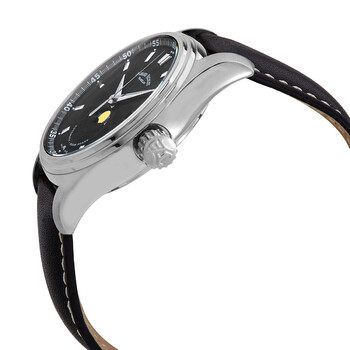 Stainless steel case with a black leather strap. Fixed stainless steel bezel. Black dial with luminous silver-tone hands and index hour markers. Arabic numeral minute markers (at 5 minute intervals). Minute markers around the outer rim. Dial Type: Analog. Luminescent hands and markers. Date display at the 3 o'clock position. Moonphase display. Sellita caliber SW280 automatic movement, containing 26 Jewels, bitting at 28800 vph, and has a power reserve of approximately 38 hours. Scratch resistant sapphire crystal. Transparent case back. Round case shape. Case size: 42 mm. Case thickness: 13 mm. Tang clasp. Water resistant at 100 meters / 330 feet. Functions: date, moon phase, hour, minute, second. Mh2 Series. Dress watch style. Watch label: Swiss Made. Armand Nicolet MH2 Automatic Black Dial Men's Watch A640L-NR-P140NR2.