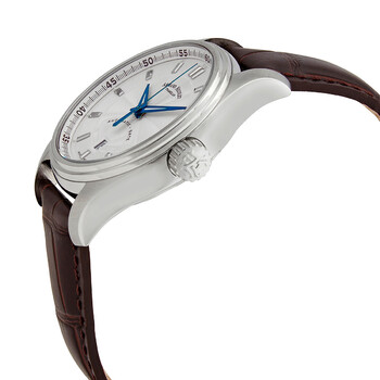Stainless steel case with a dark brown leather strap. Fixed stainless steel bezel. Silver-tone dial with blue hands and index hour markers. Arabic numeral minute markers (at 5 minute intervals). Minute markers around the outer rim. Dial Type: Analog. Luminescent hands and markers. Date display at the 6 o'clock position. ETA caliber 2824-2 automatic movement, based upon ETA 2824, containing 25 Jewels, bitting at 28800 vph, and has a power reserve of approximately 38 hours. Scratch resistant sapphire crystal. Screw down crown. Transparent case back. Round case shape. Case size: 43 mm. Case thickness: 13 mm. Band width: 22 mm. Deployment clasp. Water resistant at 100 meters / 330 feet. Functions: date, hour, minute, second. Mh2 Series. Luxury watch style. Watch label: Swiss Movt. Armand Nicolet MH2 Automatic Silver Dial Men's Watch A640A-AG-P840MR2.