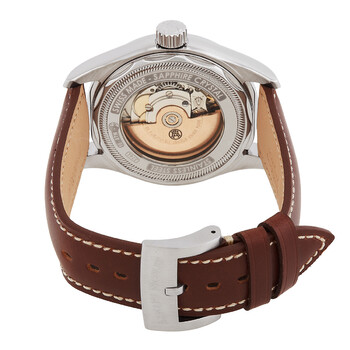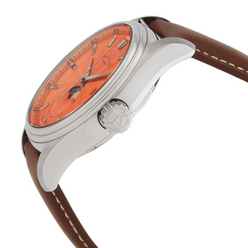 Stainless steel case with a brown leather strap and tang buckle. Fixed stainless steel bezel. Salmon dial with luminous silver-tone hands and index hour markers. Arabic numeral minute markers (at 5 minute intervals). Minute markers around the outer rim. Dial Type: Analog. Luminescent hands and markers. Date display at the 3 o'clock position. Moonphase display. Sellita caliber SW280 automatic movement, containing 26 Jewels, bitting at 28800 vph, and has a power reserve of approximately 38 hours. Scratch resistant sapphire crystal. Pull / push crown. Transparent case back.