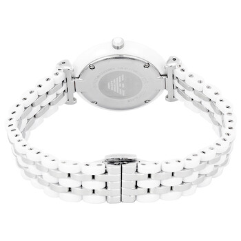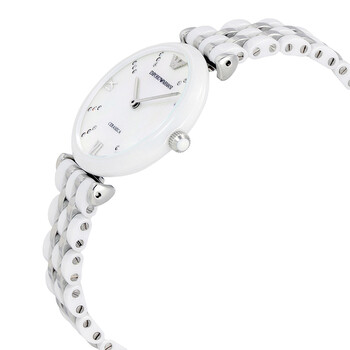 White ceramic case with a white ceramic bracelet with stainless steel links. Fixed white ceramic bezel. Mother of pearl dial with silver-tone hands and crystal-set index hour markers. Roman numerals mark the 3, 6, and 9 o'clock positions. The Emporio Armani logo appears at the 12 o'clock position. Dial Type: Analog. Quartz movement. Scratch resistant mineral crystal. Pull / push crown. Solid case back. Case size: 32 mm. Case thickness: 7.5 mm. Round case shape. Band width: 14 mm. Fold over clasp. Water resistant at 50 meters / 165 feet. Functions: hour, minute, second. Casual watch style. Armani Ceramica Mother of Pearl Dial Ladies Watch AR1488.