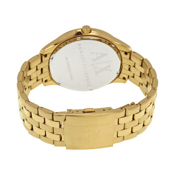 Gold-plated stainless steel case and bracelet. Fixed gold-plated bezel. Black dial with gold-tone hands and index hour markers. Minute markers around the outer rim. Dial Type: Analog. Luminescent hands and markers. Quartz movement. Scratch resistant mineral crystal. Pull / push crown. Solid case back. Round case shape. Case size: 45 mm. Case thickness: 8 mm. Band width: 20 mm. Deployment clasp. Water resistant at 50 meters / 165 feet. Functions: hour, minute, second. Casual watch style. Armani Exchange Black Dial Gold-plated Men's Watch AX2145.