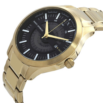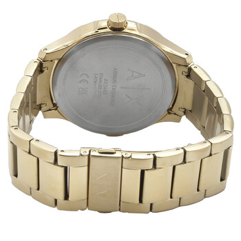 Gold-tone stainless steel case and bracelet. Fixed gold-tone stainless steel bezel. Black dial with gold-tone hands and index hour markers. Minute markers around the outer rim. Dial Type: Analog. Date display at the 3 o'clock position. Quartz movement. Scratch resistant mineral crystal. Pull / push crown. Solid case back. Round case shape, case size: 46 mm. Band width: 22 mm. Fold over clasp with a safety release. Water resistant at 50 meters / 165 feet. Functions: date, hour, minute, second. Hampton Series. Dress watch style. Armani Exchange Hampton Quartz Black Dial Men's Watch AX2443.