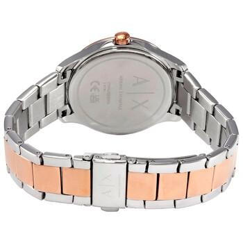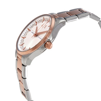 Stainless steel case with a two-tone (silver-tone and rose gold-tone) stainless steel bracelet. Fixed rose gold-tone bezel. White (crystal-set) dial with rose gold-tone hands and index hour markers. Dial Type: Analog. Quartz movement. Scratch resistant mineral crystal. Pull / push crown. Solid case back. Round case shape. Case size: 36 mm. Band width: 18 mm. Fold over clasp with a safety release. Water resistant at 50 meters / 165 feet. Functions: hour, minute, second. Lady Hampton Series. Dress watch style. Armani Exchange Lady Hampton Quartz White Dial Two-tone Ladies Watch AX5258.
