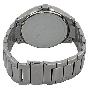 Gunmetal ion-plated stainless steel case and bracelet. Fixed gunmetal ion-plated bezel. Light grey etched dial with gunmetal hands and index hour markers. Arabic numeral minute markers (at 5 minute intervals). Minute markers around the outer rim. The Armani Exchange logo appears at the 12 o'clock positions. Dial Type: Analog. Date display at the 3 o'clock position. Quartz movement. Scratch resistant mineral crystal. Pull / push crown. Solid case back. Case size: 46 mm. Case thickness: 12 mm. Round case shape. Band width: 22 mm. Fold over deployment clasp. Water resistant at 50 meters / 165 feet. Functions: date, hour, minute, second. Dress watch style. Armani Exchange light Grey Dial Men's Watch AX2194.
