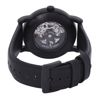 Black-plated stainless steel case with a black leather strap. Fixed black-plated bezel. Black (cut-out) dial with luminous black hands and index hour markers. Dial Type: Analog. Luminescent hands. Automatic movement. Scratch resistant mineral crystal. Pull / push crown. Transparent case back. Round case shape. Case size: 44 mm. Case thickness: 12 mm. Band width: 20 mm, band length: 7.5 inches. Tang clasp. Water resistant at 50 meters / 165 feet. Functions: hour, minute, second. Luigi Series. Fashion watch style. Armani Luigi Automatic Black Dial Men's Watch AR60032.