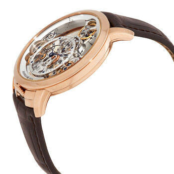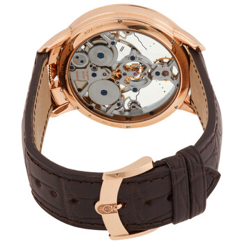 18kt rose gold case with a brown (crocodile) leather strap. Fixed 18kt rose gold bezel. Transparent (skeleton display) dial with blue hands and Roman numeral hour markers. Dial Type: Analog. Two sub-dials displaying: double power reserve indicator. Arnold & Son calibre A&S1615 Hand Wind movement, containing 27 Jewels, bitting at 21600 vph, and has a power reserve of approximately 90 hours. Scratch resistant sapphire crystal. Transparent case back. Round case shape. Case size: 44.6 mm. Tang clasp. Water resistant at 30 meters / 100 feet. Functions: hour, minute, second, power reserve indicator. Time Pyramid Series. Luxury watch style. Watch label: Swiss Made. Arnold Son Time Pyramid Hand Wind Skeleton Dial Men's Watch 1TPAR.S01A.C125.