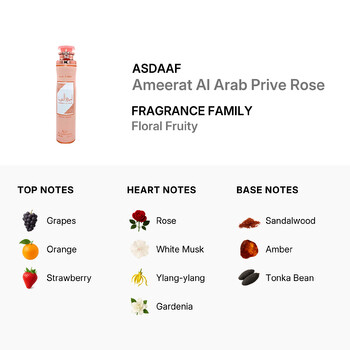 Launched in 2023, Ameerat Al Arab Prive Rose opens with a vibrant burst of grapes, orange, and strawberry, delivering a fresh and juicy introduction. The heart unfolds into a mesmerizing floral bouquet of rose, white musk, ylang-ylang, gardenia, jasmine, and lily, filling the air with femininity and grace. Finally, the base notes of sandalwood, amber, and tonka bean provide a smooth, warm, and lasting finish that lingers beautifully.