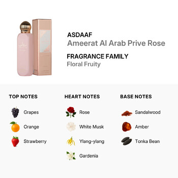 Ameerat Al Arab Prive Rose opens with a playful burst of juicy grapes, sweet oranges, and ripe strawberries. These vibrant top notes create a bright and inviting introduction, perfect for lifting your mood and energizing your senses. As the scent unfolds, delicate heart notes of rose, white musk, ylang-ylang, gardenia, jasmine, and lily bloom beautifully, adding a soft and romantic flair. These floral elements blend gracefully, wrapping you in a bouquet of elegance and feminine charm.