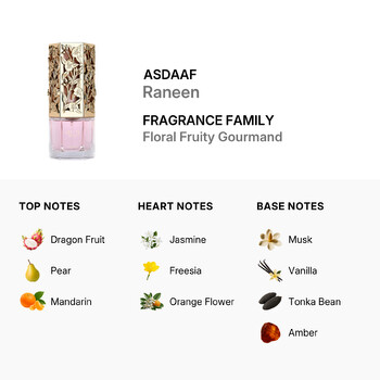 Raneen opens with a vibrant blend of dragon fruit, juicy pear, and zesty mandarin, creating a refreshing and energizing first impression. As the fragrance unfolds, delicate jasmine, freesia, and orange flower bloom at the heart, adding a soft floral touch that exudes grace and femininity. Finally, the scent settles into a warm and alluring base of musk, vanilla, tonka bean, and amber, leaving a lasting impression of sensuality and depth.