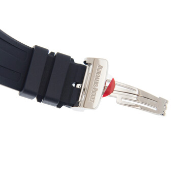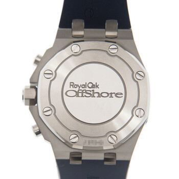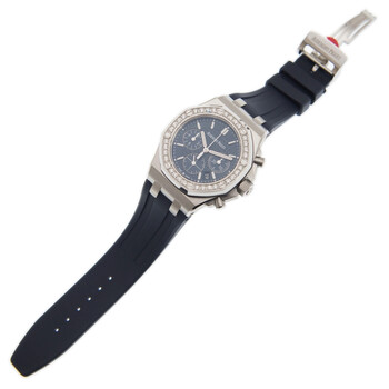 Stainless steel case with a blue rubber strap. Fixed (8 screw) stainless steel bezel set with 32 diamonds. Blue (tapisserie) dial with luminous silver-tone hands and index hour markers. Minute markers around the outer rim. Dial Type: Analog. Luminescent hands and markers. Date display between the 4 and 5 o'clock positions. Chronograph - three sub-dials displaying: 60 second, 30 minute and 12 hour. Audemars Piguet calibre 2385 automatic movement, containing 37 Jewels, composed of 304 parts, bitting at 21600 vph, and has a power reserve of approximately 40 hours. Scratch resistant sapphire crystal. Screw down crown. Solid case back. Octagon case shape. Case size: 37 mm. Case thickness: 11.8 mm. Fold over (audemars piguet) clasp. Water resistant at 50 meters / 165 feet. Functions: chronograph, column wheel, date, hour, minute, small second. Additional Info: bezel set with 32 brilliant-cut diamonds ; ~1.02 carats. Royal Oak Offshore Series. Luxury watch style. Watch label: Swiss Made. Audemars Piguet Automatic Diamond Blue Dial Ladies Watch 26231ST.ZZ.D027CA.01.