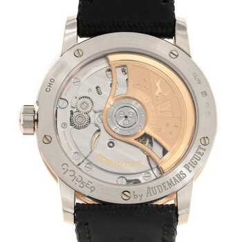 Rose gold-tone 18kt rose gold case with a black band. Fixed 18kt white gold bezel. Grey dial with rose gold-tone hands and Arabic numeral hour markers. Minute markers around the outer rim. Dial Type: Analog. Date display between 4 and 5 o'clock position. Audemars Piguet Calibre 4302 Automatic movement, containing 32 Jewels, bitting at 28800 vph, and has a power reserve of approximately 70 hours. Scratch resistant sapphire crystal. Transparent see through case back. Round case shape, case size: 41 mm, case thickness: 10.7 mm. Buckle clasp. Water resistant at 30 meters / 100 feet. Functions: date, hour, minute, second. Additional Info: original box, manual (complete accessories). Code 11.59 Series. Luxury watch style. Watch label: Swiss Made. Audemars Piguet Code 11.59 Automatic Grey Dial Men's Watch 15210CR.OO.A002KB.01.