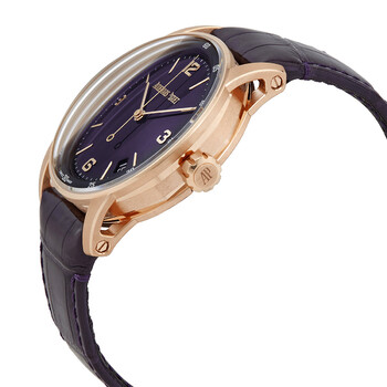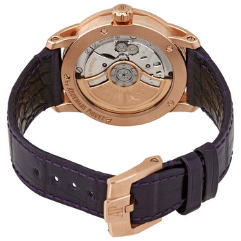18kt rose gold case with a purple (alligator) leather strap. Fixed 18kt rose gold bezel with an inlaid black ring. Purple (smoked lacquered) dial with 18k rose gold hands and index hour markers. Minute markers around the outer rim. Dial Type: Analog. Date display between the 4 and 5 o'clock positions. Audemars Piguet calibre 4302 Automatic movement, containing 32 Jewels, bitting at 28800 vph, and has a power reserve of approximately 70 hours. Scratch resistant sapphire crystal. Pull / push crown. Transparent case back. Round case shape. Case size: 41 mm. Case thickness: 10.7 mm. 18kt white gold tang clasp. Water resistant at 30 meters / 100 feet. Functions: date, hour, minute, second. Code 11.59 Series. Luxury watch style. Watch label: Swiss Made. Audemars Piguet Code 11.59 Automatic Watch 15210OR.OO.A616CR.01.